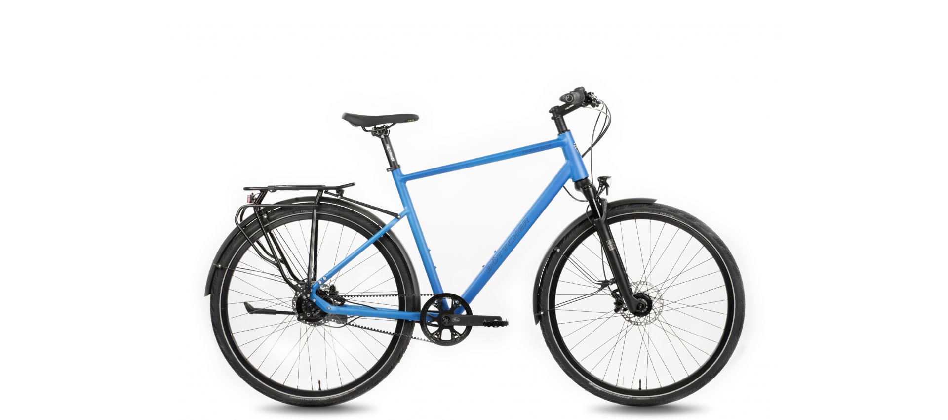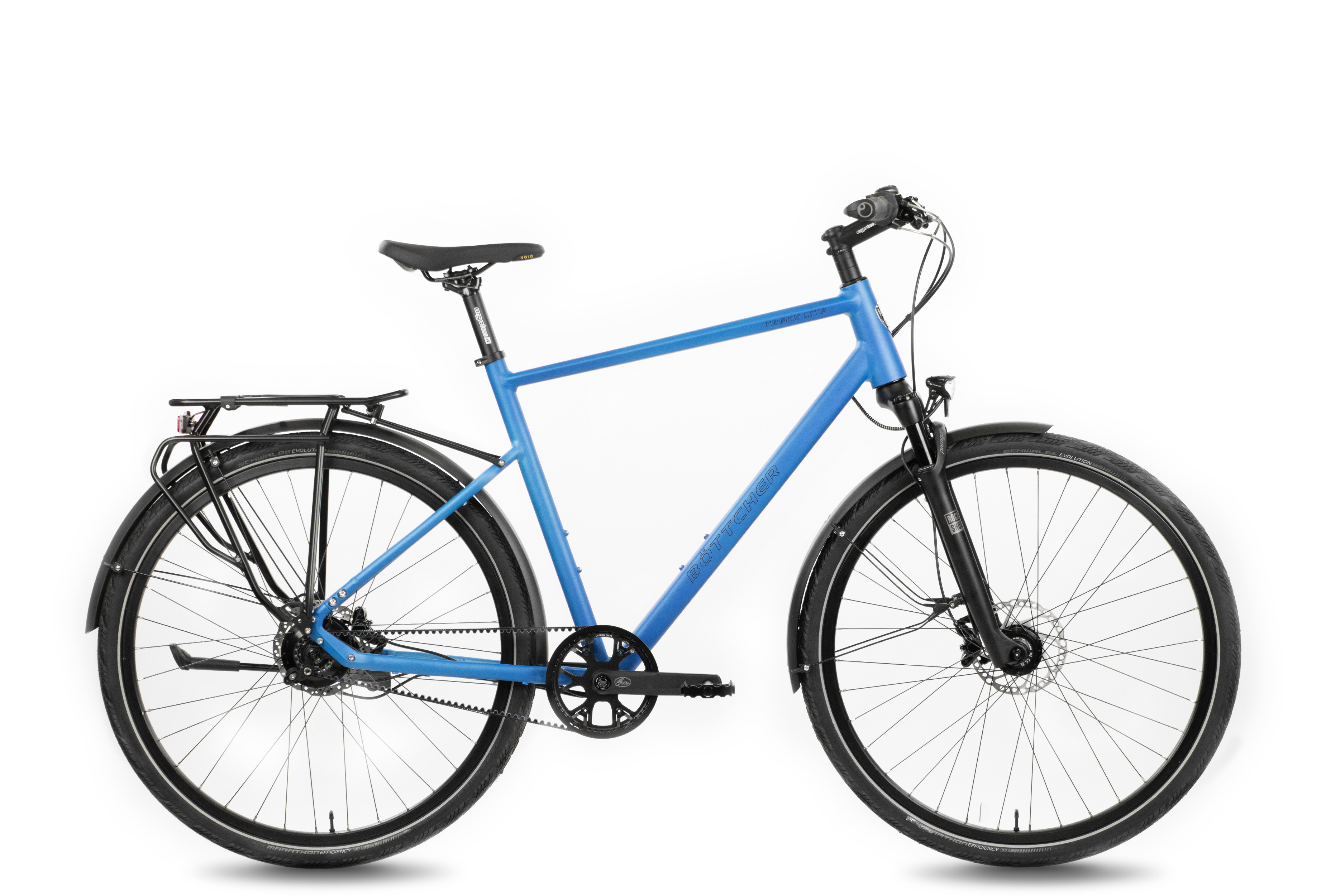 Durch die hochwertigen Komponenten – egal ob 28“ Laufräder, Schwalbe Marathon Reifen oder den Shimano DISC-Bremsen – macht das Trekk Lite in jeder Fahrsituation eine gute Figur. Durch die sportlich moderaten Geometrien haben Sie eine entspannte Sitzposition. Die Rahmenöffnung am Hinterbau ermöglicht die Verwendung eines Riemens von Gates. Der Lenker, die Griffe und der Sattel sind ergonomisch geformt und dienen als gute Unterstützung auf längeren Touren. Mit der eleganten Optik, kombiniert mit sicherem Fahrverhalten und langlebiger Technik, haben wir ein zuverlässiges Trekkingrad geschaffen. Egal ob für den Alltagseinsatz oder für längere Touren, mit diesem Fahrrad sind Sie mobil, flexibel und sicher unterwegs. Genießen Sie das Gefühl grenzenloser Freiheit mit Ihrem individuell zusammengestellten Böttcher Trekk Lite.